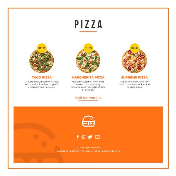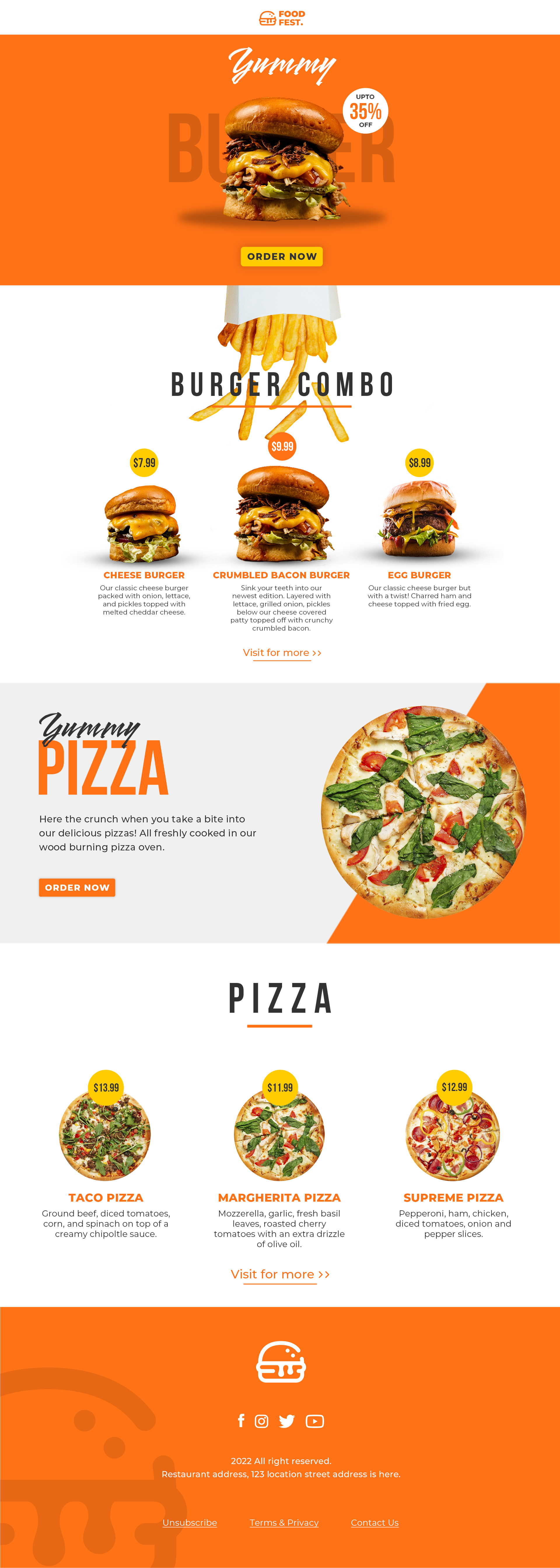 This project showcases an email advertising campaign for a restaurant named Food Fest. It introduces a promotion and leads into a menu with calls to action throughout the composition. The use of imagery and fun design reflects the company's delicious food.