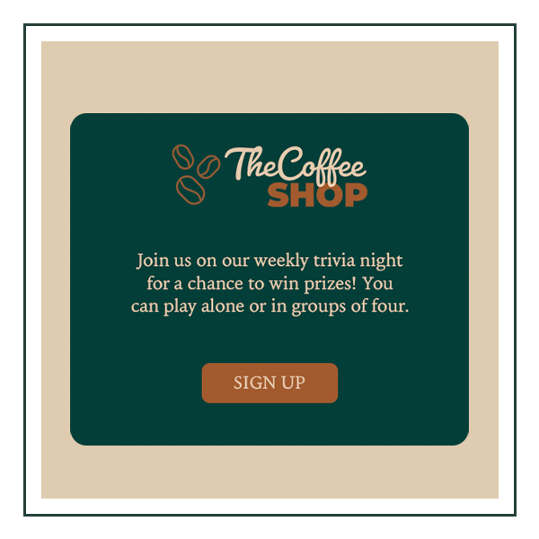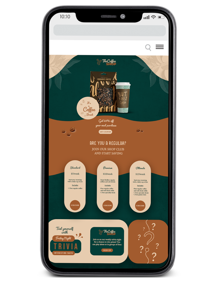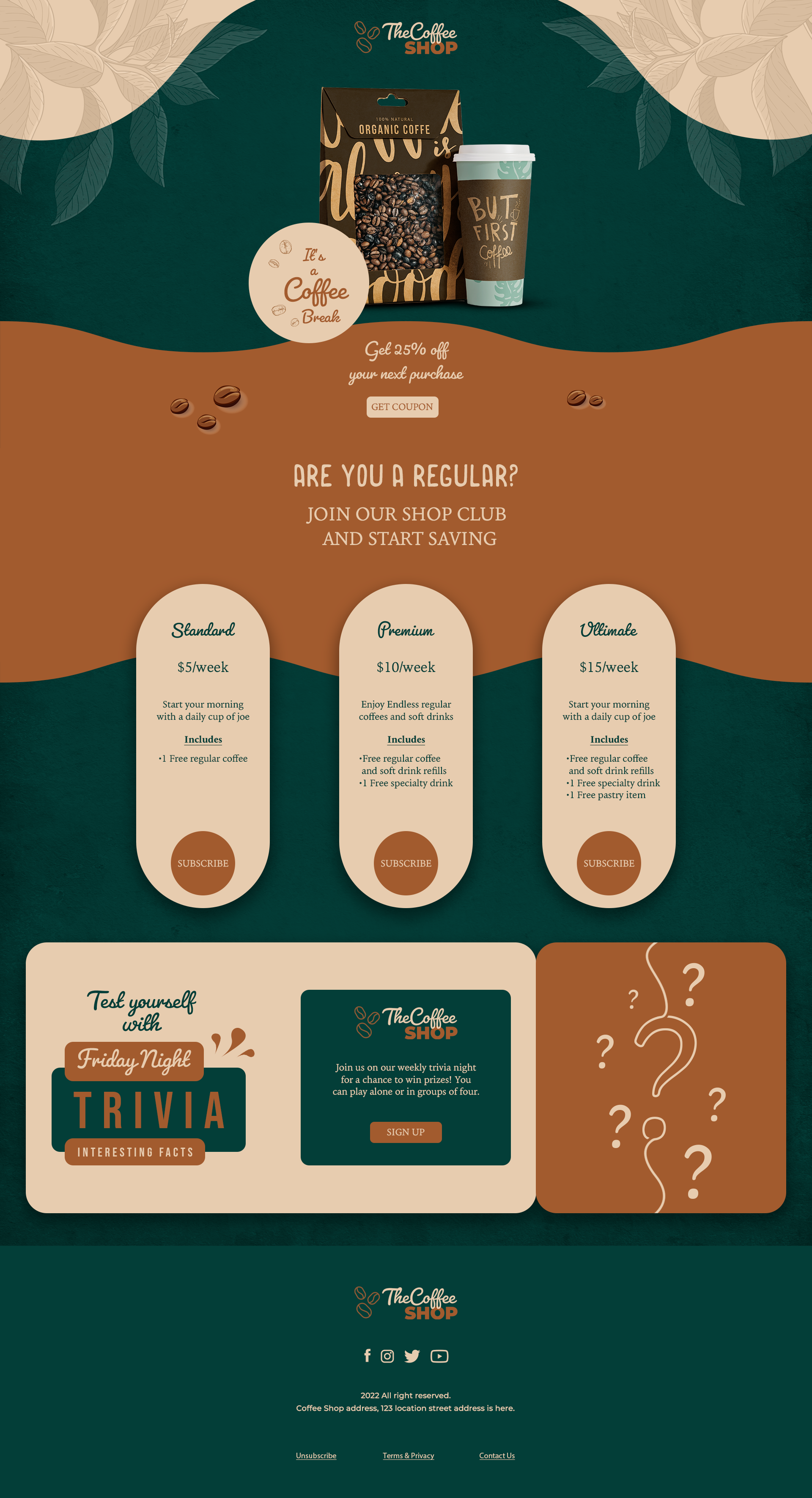 This project showcases an email advertising campaign for a coffee shop. It introduces a promotion then leads into subscription services and events with calls to action throughout the composition. The use of imagery and fun design reflects the company's fun atmosphere and amazing coffee.