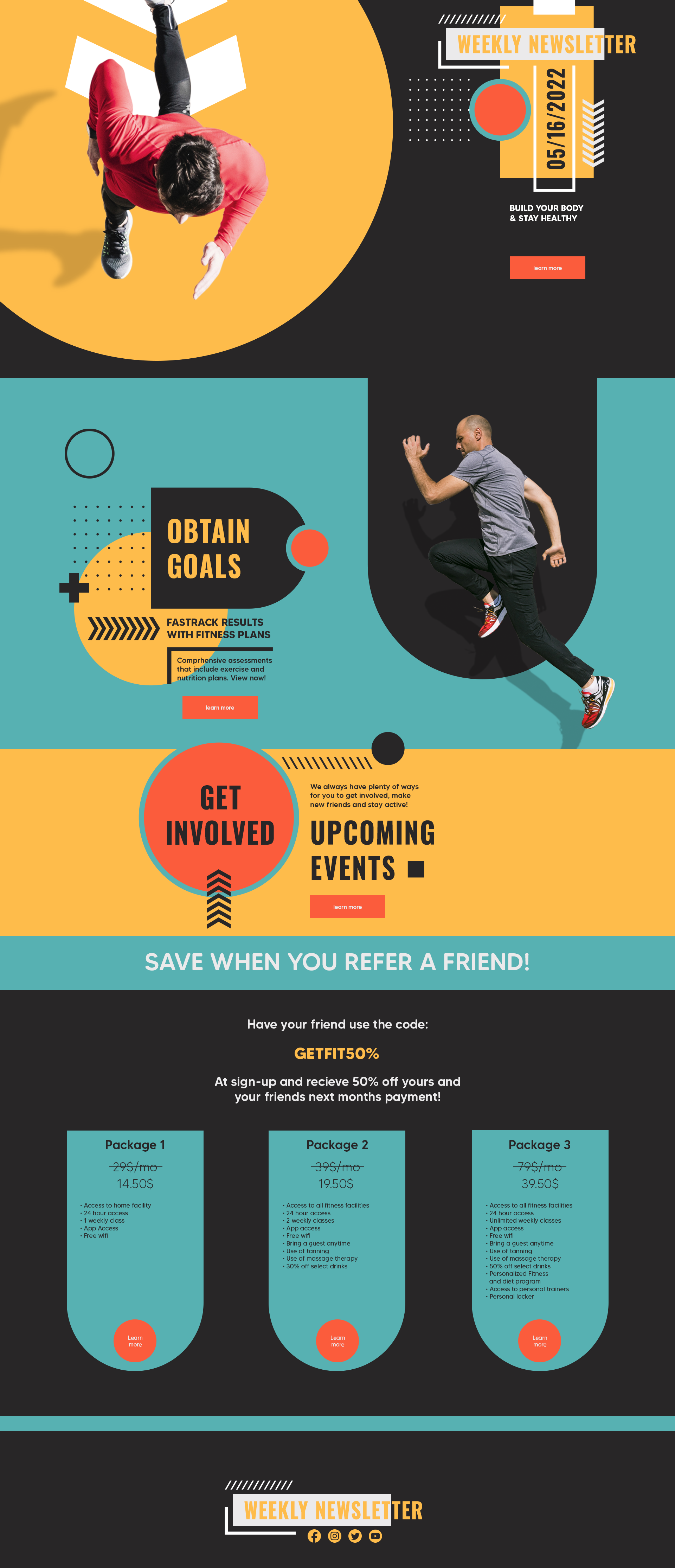 This project showcases an email advertising campaign for a gym in the form of a weekly newsletter. It introduces training programs then leads into events and ends with a promotion with calls to action throughout the composition. The use of imagery and fun design reflects the company's fun atmosphere and engaging atmosphere.