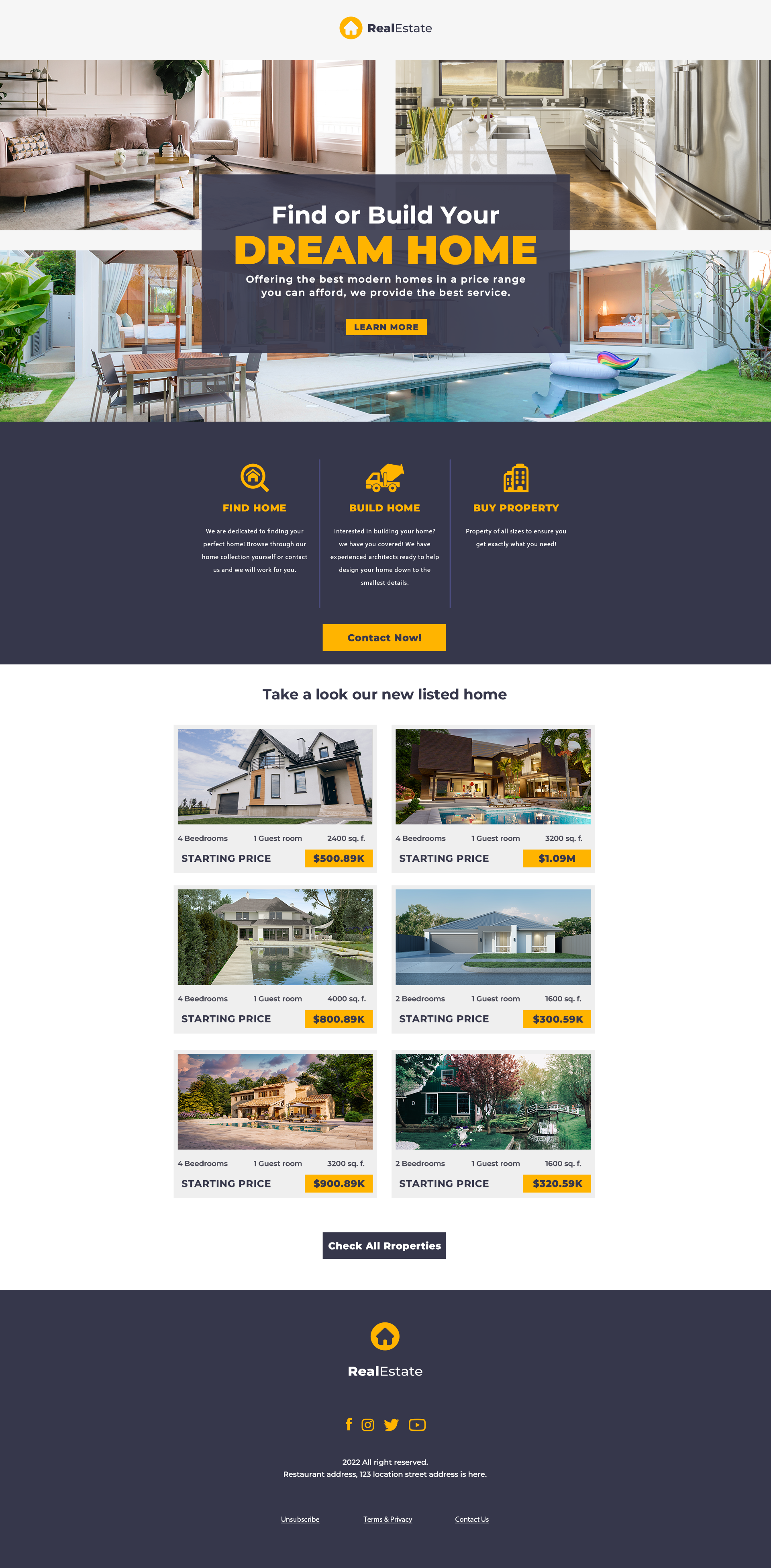 This project showcases an email advertising campaign for a real estate company. It introduces call to action for your dream home then leads into services and ends with new home listings with calls to action throughout the composition. The use of imagery and professional design reflects the company's dedication to clients.